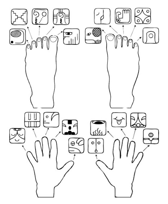The reason that the Ancient Mayan language is being used, is that the Ancient Mayans were the first to associate the body language of toes and fingers as messages from “the great spirit that moves through all things“. The respective glyphs of the fingers and toes are interpreted as abstract concepts. Ancient mystics used concepts instead of literal associations, so that the message they are trying to give through association, can endure through the ages. The physical environment may change over centuries, but abstract concepts do not.